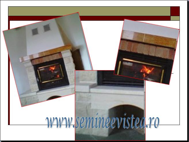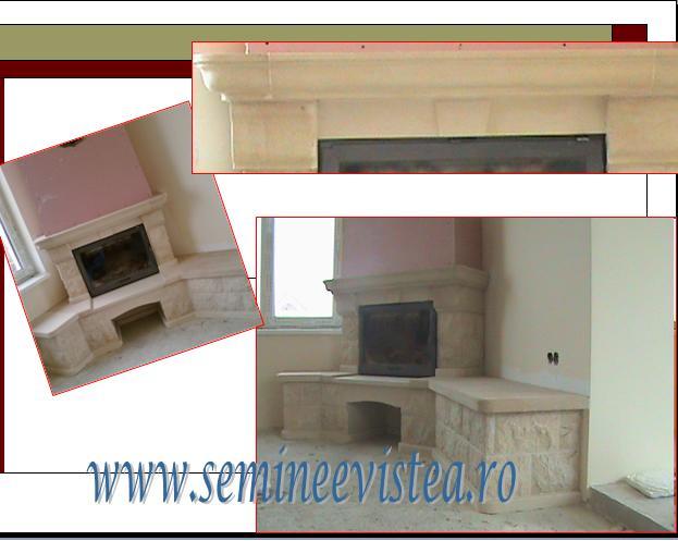 - Semineu rustic din piatra naturala. Element stalp sculptat. Polita lemn masiv. Placa granit. Focar din fonta