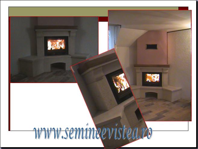 - Semineu modern pe colt din piatra naturala. Focar din fonta