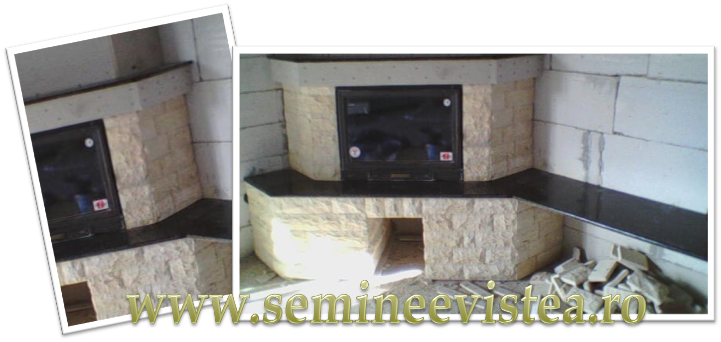 - Semineu rustic pe colt din piatra naturala gri si placa granit negru. Focar din fonta