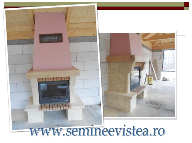 - Semineu modern pe colt din piatra naturala. Focar din fonta