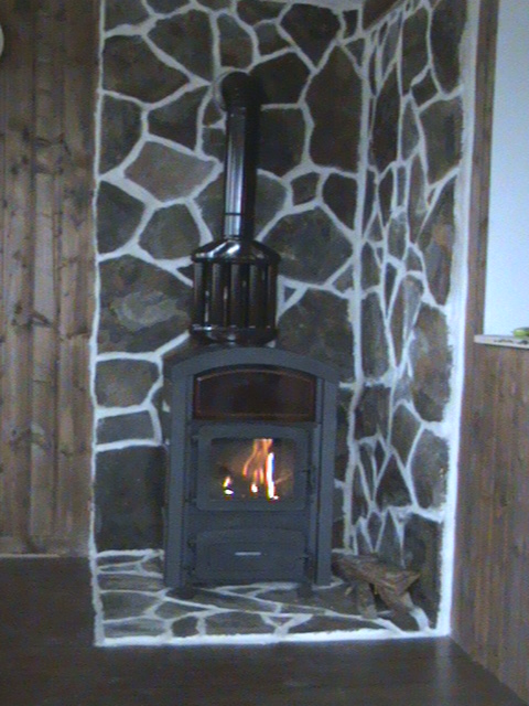 - Semineu rustic pe colt din piatra naturala gri si placa granit negru. Focar din fonta